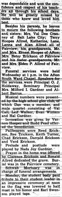 Baldwin, Stella Taggart (29 Jan 1963) (1) Download Full Size Item#: 25652 Categories Obituaries , Inside Star Valley Search All Artifacts Search Recenty Viewed Allred, Dan DeVon (21 Nov 1954) (2)
