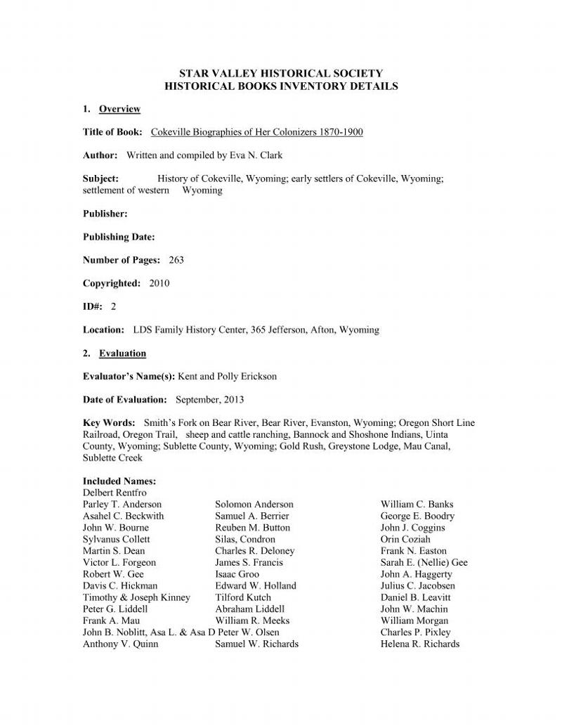 Cokeville, Biographies of Her Colonizers Download Document Item#: 51143 Categories Histories And Stories , PDF Year Created 2010 Author Eva N Clark Subject Cokeville Item Location Building: SVHS Barn Search All Artifacts Search Recenty Viewed Agriculture, Dairy, Cheese, Railhead Archibald Gardner