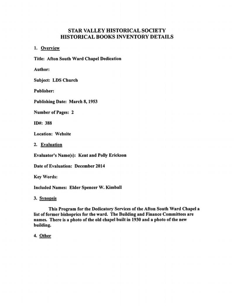 This Program for the Dedicatory Services of the Afton South Ward Chapel a list of former bishoprics for the ward. The Building and Finance Committees are names. There is a photo of the old chapel built in 1930 and a photo of the new building.