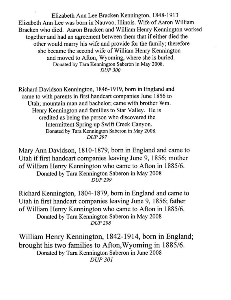 Hartland, New York; Northumberland, England; LDS Church, Nauvoo, Mt. Pisgah, Toole, Utah; Bear Lake Valley, Star Valley, Glen, Wyoming.