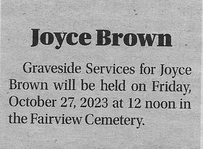 Brown, Joyce Obituary d.22 Oct 2023 Download Full Size Brown, Joyce Graveside d.22 Oct 2023 Download Full Size Item#: 63845 Categories Fairview Wyoming , Obituaries , Cemeteries In Star Valley , Fairview Cemetery Wyoming , Graveside Service Synopsis Obituary of Joyce Brown published in Star Valley Independent 8 Nov 2023, Vol.122, # 35, 5A Graveside Services for Joyce Brown published in Star Valley Independent 25 Oct 2023, Vol.122, # 34, 5A Item Location Website Search All Artifacts Search