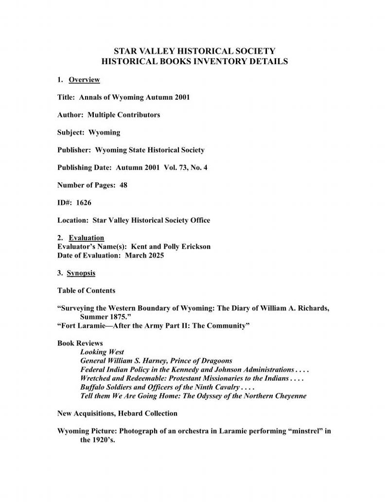 Table of Contents “Surveying the Western Boundary of Wyoming: The Diary of William A. Richards, Summer 1875.” “Fort Laramie—After the Army Part II: The Community” Book Reviews Looking West General William S. Harney, Prince of Dragoons Federal Indian Policy in the Kennedy and Johnson Administrations . . . . Wretched and Redeemable: Protestant Missionaries to the Indians . . . . Buffalo Soldiers and Officers of the Ninth Cavalry . . . . Tell them We Are Going Home: The Odyssey of the Northern Cheyenne New Acquisitions, Hebard Collection Wyoming Picture: Photograph of an orchestra in Laramie performing “minstrel” in the 1920’s.