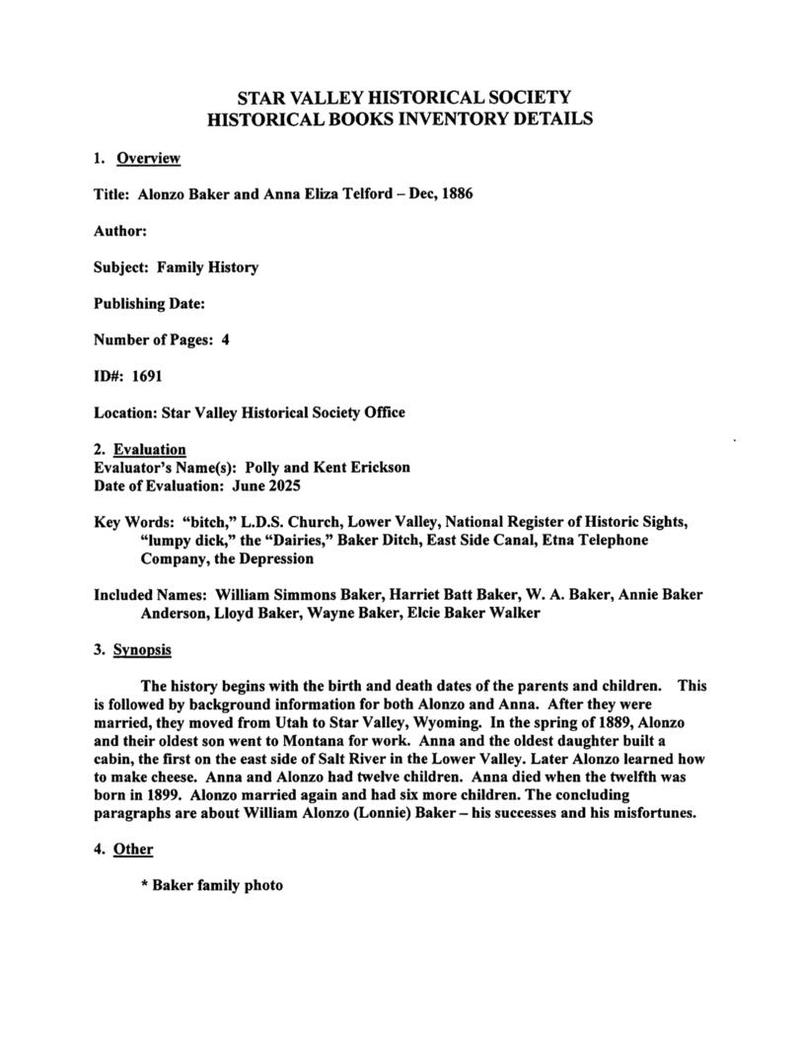 The history begins with the birth and death dates of the parents and children. This is followed by background information for both Alonzo and Anna. After they were married, they moved from Utah to Star Valley, Wyoming. In the spring of 1889, Alonzo and their oldest son went to Montana for work. Anna and the oldest daughter built a cabin, the first on the east side of Salt River in the Lower Valley. Later Alonzo learned how to make cheese. Anna and Alonzo had twelve children. Anna died when the twelfth was born in 1899. Alonzo married again and had six more children. The concluding paragraphs are about William Alonzo (Lonnie) Baker – his successes and his misfortunes. * Baker family photo