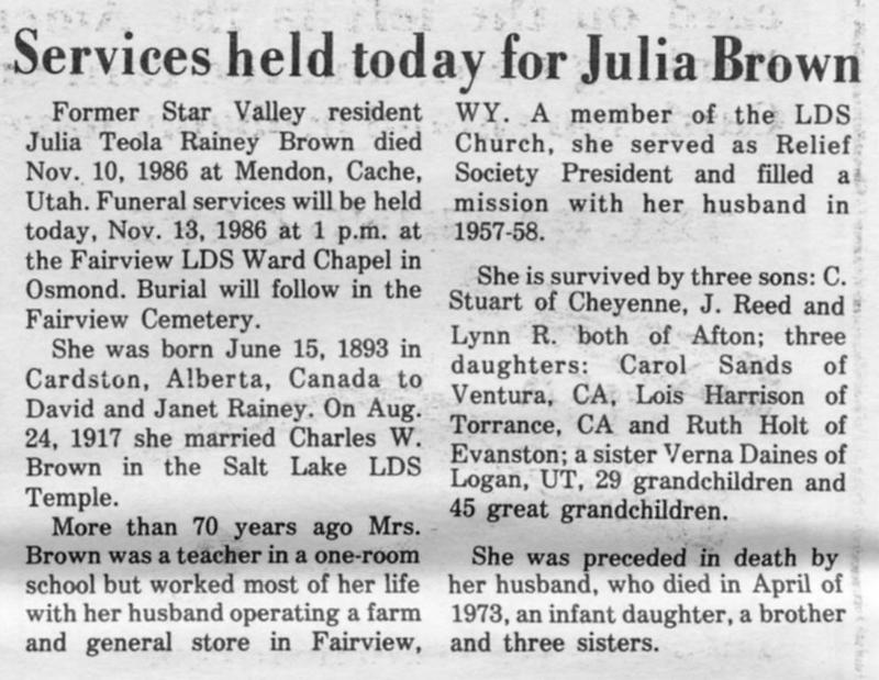 Brown, Julia Teola Rainey (10 Nov 1986) Download Full Size Item#: 26288 Categories Obituaries , Inside Star Valley Search All Artifacts Search